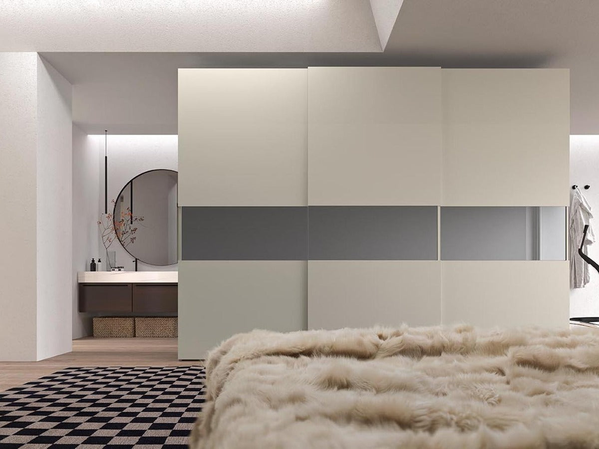 The door panel of the Clara wardrobe with sliding doors is divided into three parts. This feature allows you to play with numerous combinations of wood veneers, glass and lacquered finishes.