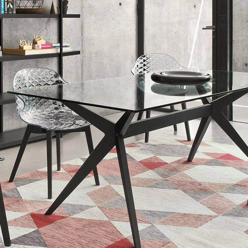 The Kent is a non-extendable design and comfortably seats 4-6 people. The tops are available in different sizes, with transparent glass or glass-ceramic and different finishes. The wooden frame features legs which support the different tops and a wooden beam as a connecting element.