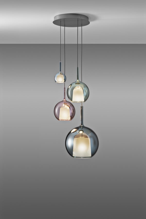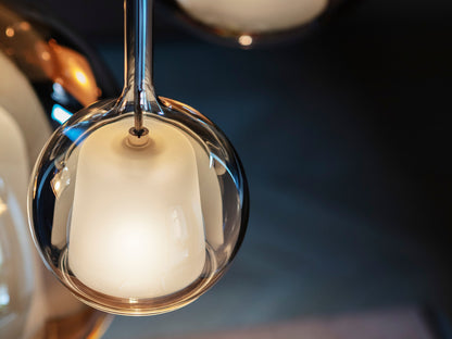 Designed by Penta, the Glo Mini Pendant lamp is a smaller version of the popular Glo pendant light, featuring a chromed metal body structure and hand-blown glass shades.
