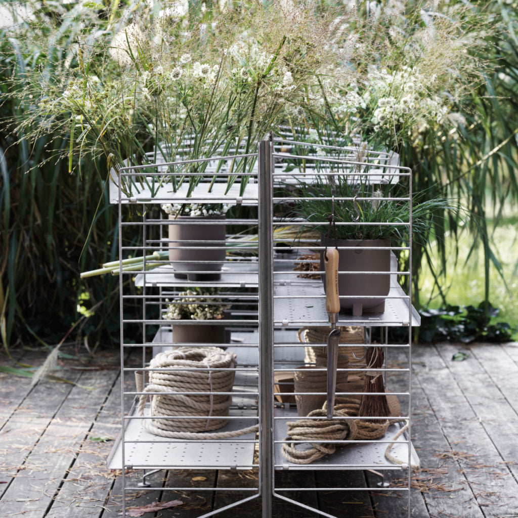 Free standing galvanized shelf intended for outdoor use. This larger three section combination is optimized with shelves on either side of the shelf. A mix of galvanized metal shelves with high and low edge are added to give the combination character. The galvanized material changes over time and leaves you with a beautiful patina.