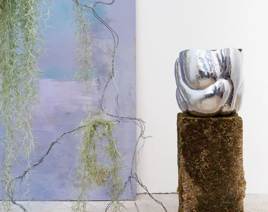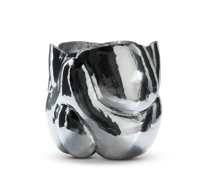 The Cloud Vessel short is crafted from highly reflective polished aluminium, resembling a sculptural masterpiece. Skilfully handmade in India by artisans, each vessel possesses distinct qualities, capturing the unique marks from the metal's stretching and warping process. These preserved hammer indentations reflect the meticulous craftsmanship invested in its design. The silver vessel, reminiscent of seed pods, serves multiple purposes, whether as an elegant champagne bucket or a stylish vase. Embrace the artistry and versatility embodied in the Cloud vessel.